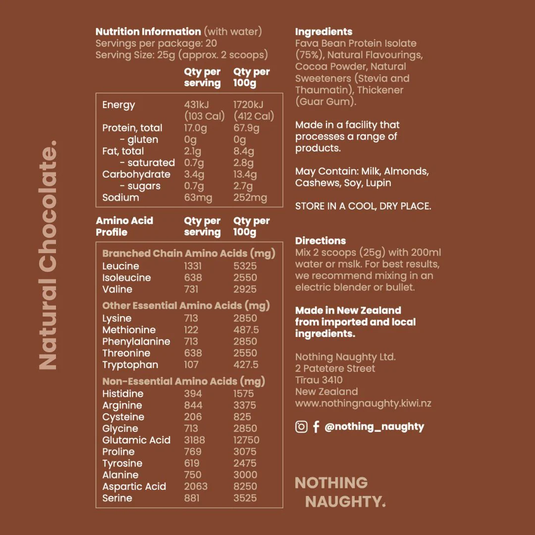 Proudly blended in New Zealand, Nothing Naughty Lean Bean Protein delivers clean, sustainable, plant-based nutrition you can feel good about. Full nutritional info in photos.