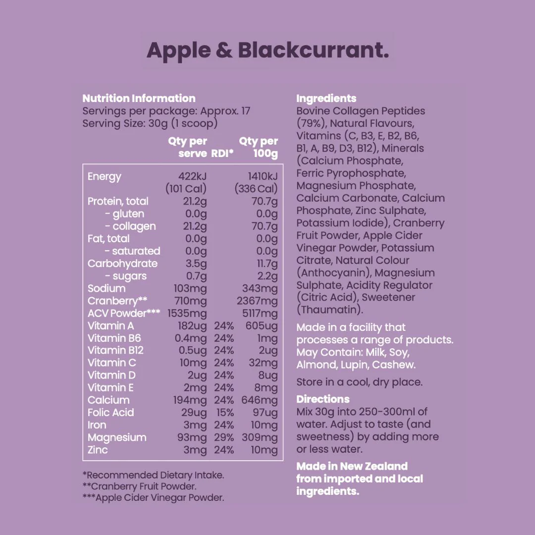 Each serve delivers over 21g of premium bovine collagen peptides, 10 essential vitamins, and naturally functional ingredients like cranberry fruit powder and apple cider vinegar powder, supporting skin health, energy, vitality, and everyday wellbeing.